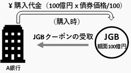 まず、JGB購入に伴いA銀行はその購入代金を支払い、その対価として金利収入を受取ります。